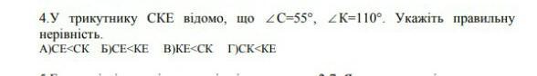 Так как сума углов треугольника 180 градусов, угол Е равен 15 градусов. Против него лежит сторона СК, которая является самой маленькой, исходя из первого утверждения.