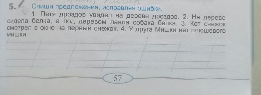 1. Петя Дроздов увидел на дереве дроздов. 2. На дереве сидела белка, а под деревом лаяла собака Белка. 3. Кот Снежок смотрел в окно на первый снежок. 4. У друга Мишки нет плюшевого мишки.