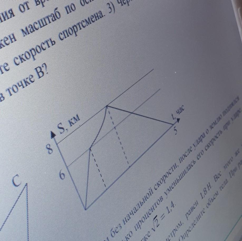 точка В - середина пути и вершина равнобедренного треугольника. Согласно графика до т.В 8 км, а значит обе стороны треугольника равны 8км. Всь путь 8*2=16 км занял по времени 5 часов, т.е. скорость была 16км/5ч=3.2км/ч.