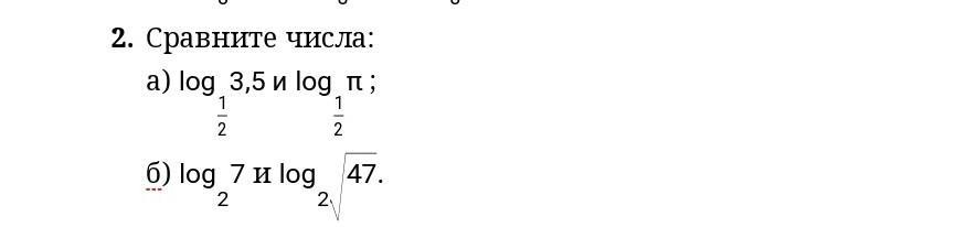 б) логарифм 7 по основанию 2 будет равен 2,807 . а логарифм корня из 47 по основанию 2 будет равен примерно 2,766 (ведь корень из 47 примерно 6,8). Значит первый логарифм будет больше.