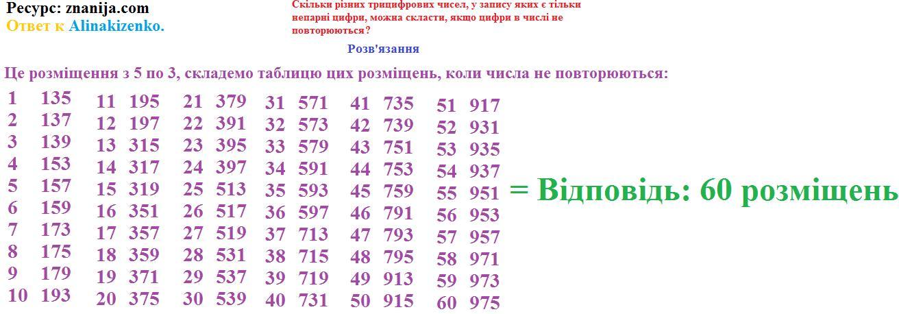 1) Всього непарних чисел є п'ять: 1, 3, 5, 7, 9. Питається: скільки трицифрових чисел можна скласти із цих 5 непарних чисел? При цьому числа повинні не повторюватись. Останнє означає, що числа, до прикладу, 555, 551, 551, 115, 177, 133 і т.д. - неможливі, адже в них повторюються 5, 1, 7 і 3 два чи більше разів! До речі, якщо треба скласти трицифрові числа із 5 непарних, тоді і самі трицифрові числа будуть непарними, адже парних немає!