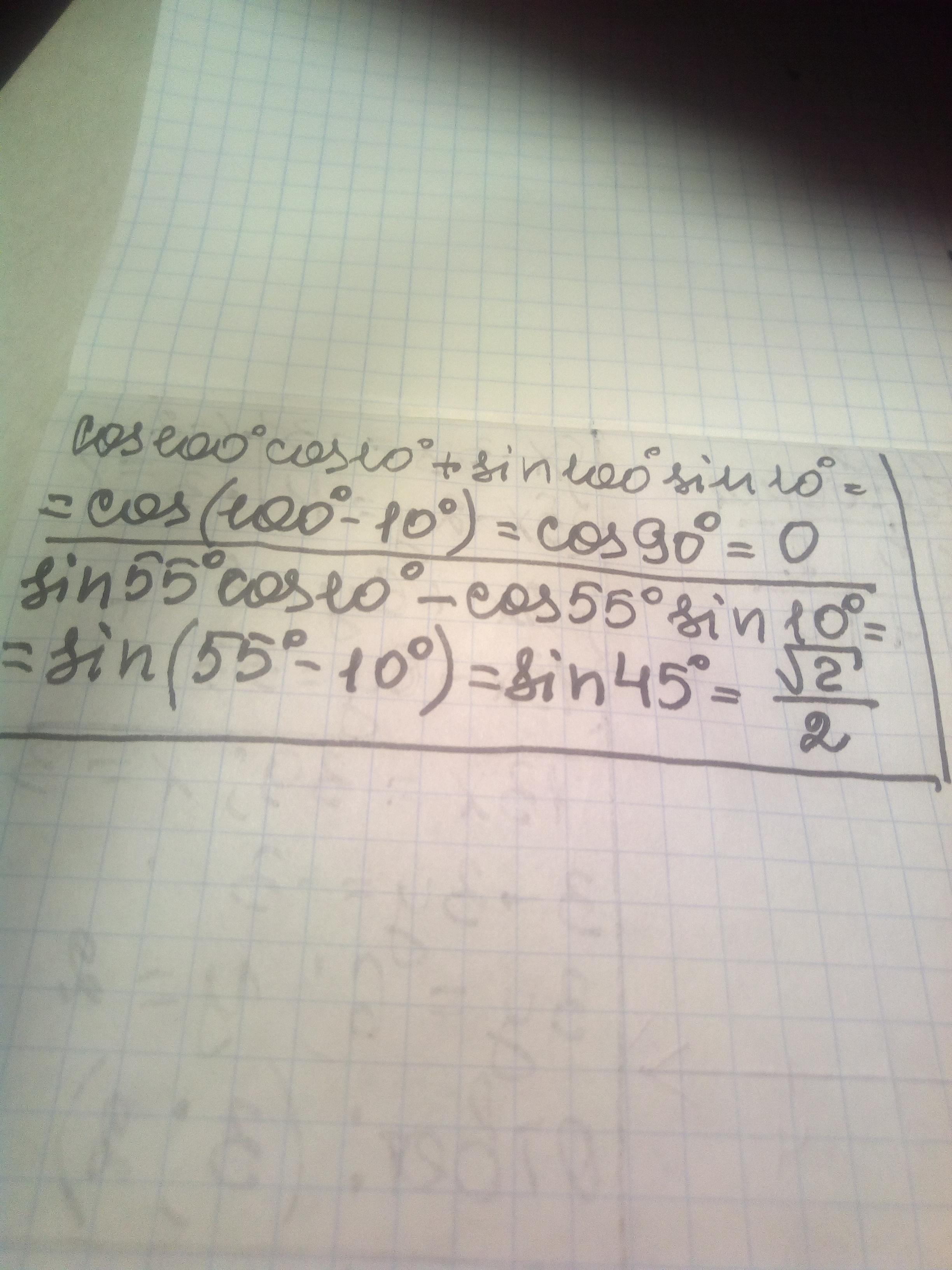 2) sin55°⋅cos10°−cos55°⋅sin10° .
