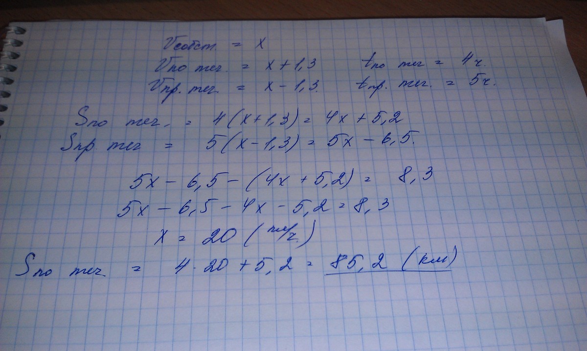 Моторная лодка шла 4 часа по течению,и 5 часов против течения.Путь пройденный лодкой против течения на 8,3 км длиннее,чем путь,пройденный по течению.Найдите путь,пройденный по течению,если скорость течения реки 1,3км/ч