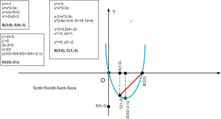 Socdb=-∫₀³ (x²-3x)dx=∫₀³ (3x-x²)dx=3/2 x² - x³/3 l₀³=1,5*9-27/3=13.5-9=4,5