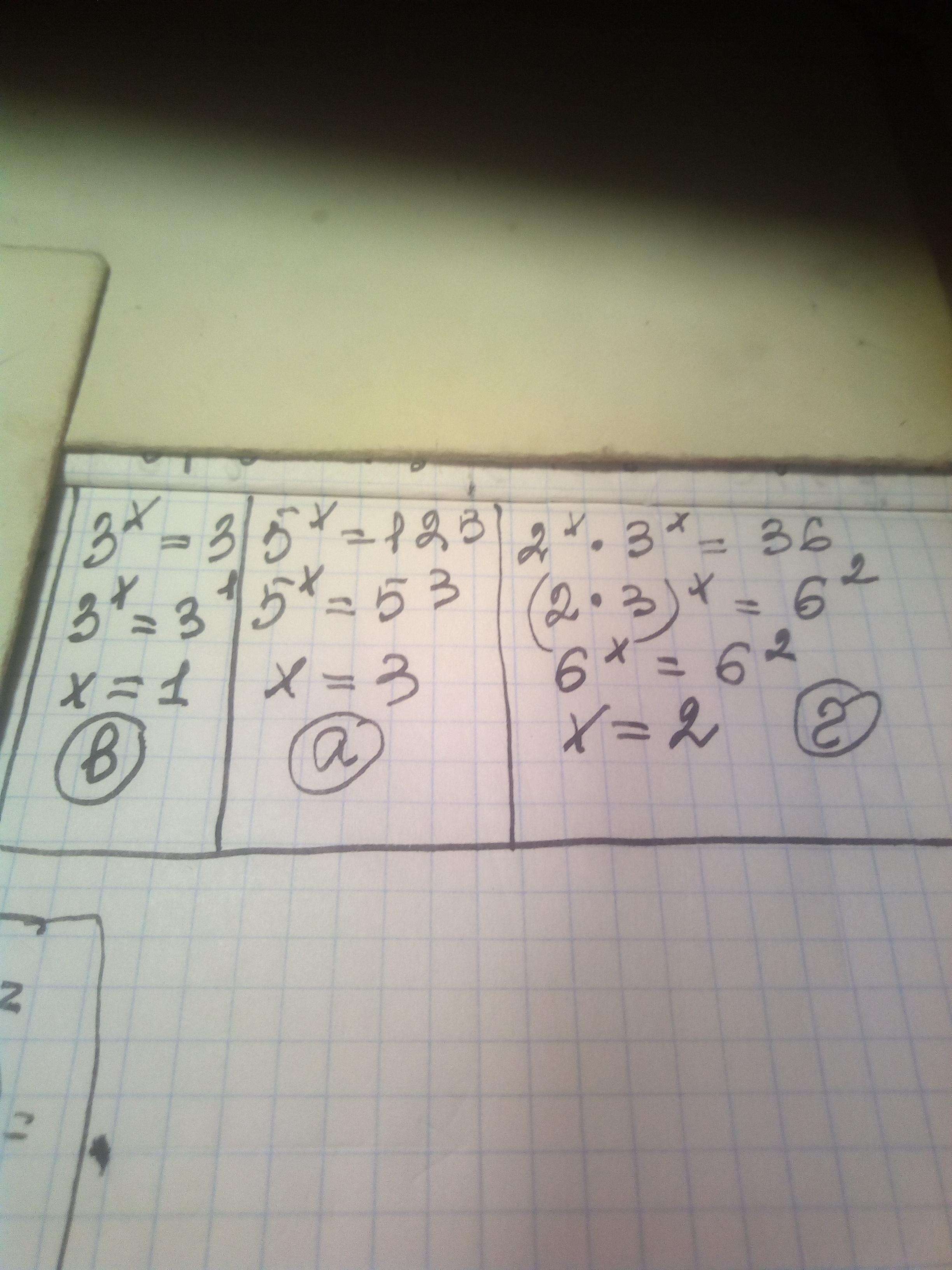 розвяжіть рівняня і вмтановіть відповідність між умовою та коренем рівняня 1)3^х=3 2)5^х=125 3)2^х×3^х=36 а)3б)0,в)1,г)2