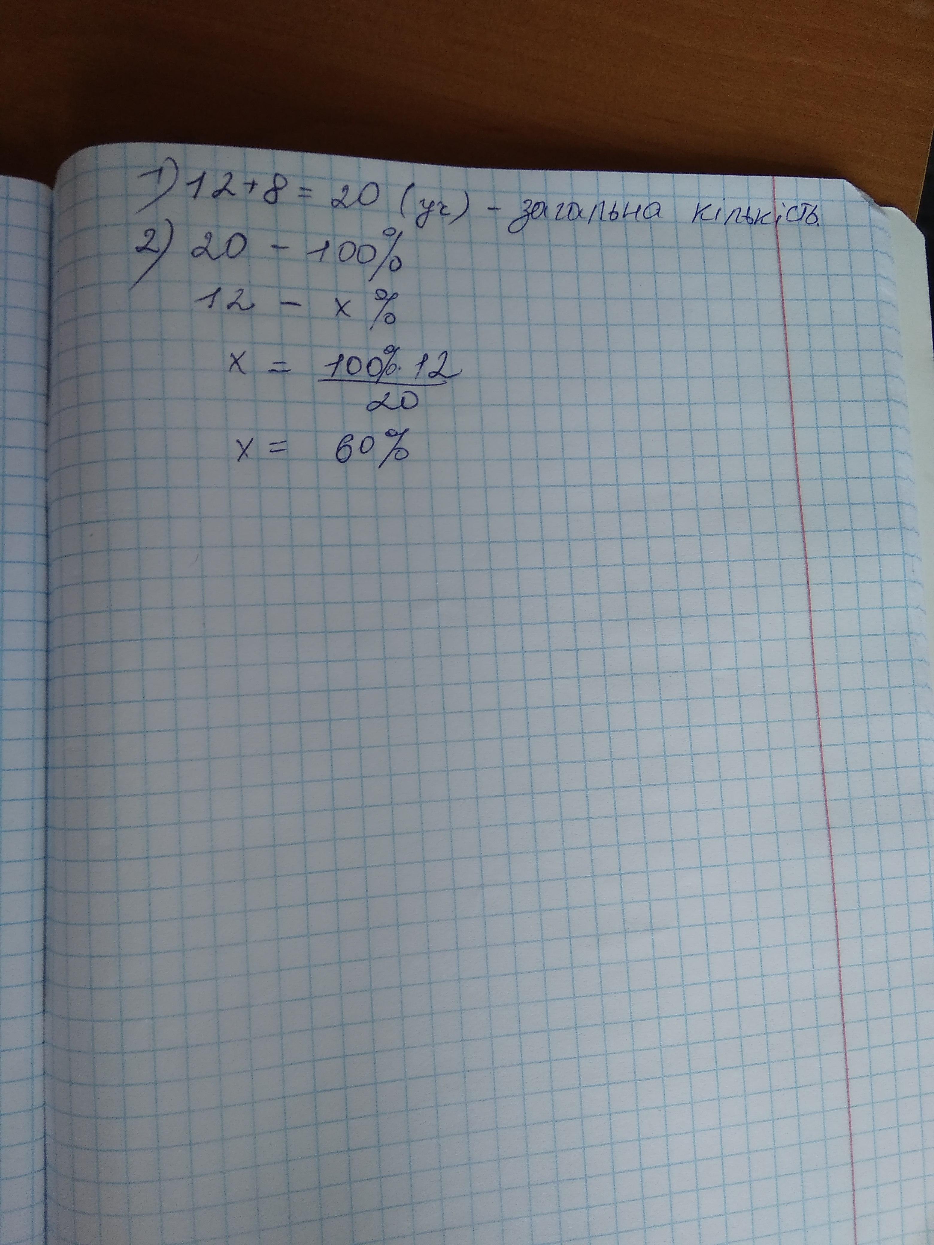 В класі навчаються 12 дівчат та 8 хлопців. Скільки відсотків становлять дівчата від загальної кількості учнів класу?