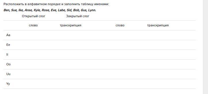 Расположить в алфавитном порядке и заполнить таблицу именами: