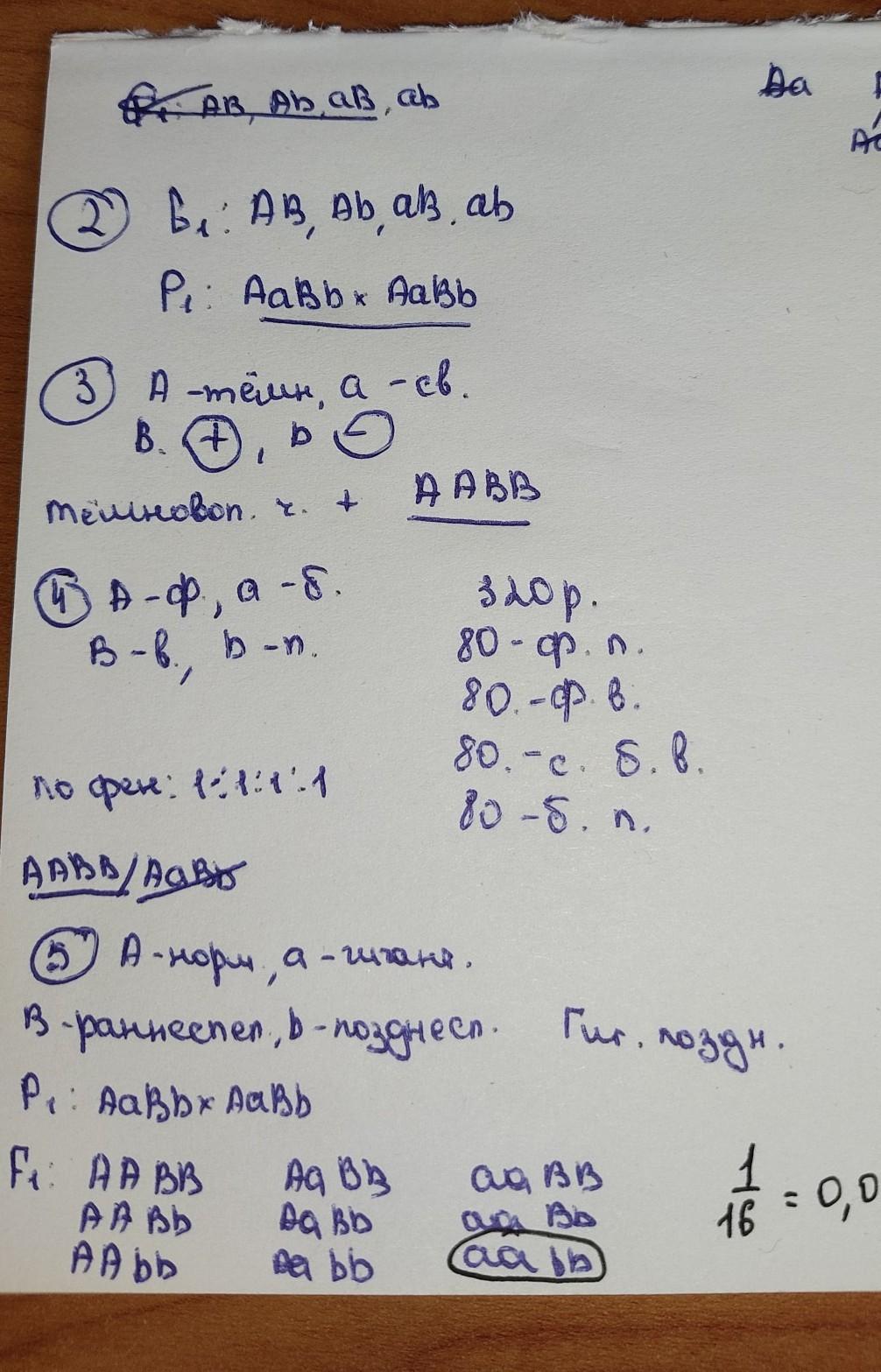 4)У гороха фиолетовая окраска цветков A доминирует над белой a, а верхушечное расположение B — над пазушным b. Определи генотип растений гороха, имеющих доминантные признаки, если при анализирующем скрещивании получено 320 растений: 80 — с фиолетовыми верхушечными цветками, 80 — с фиолетовыми пазушными цветками, 80 — с белыми верхушечными цветками, 80 — с белыми пазушными цветками.