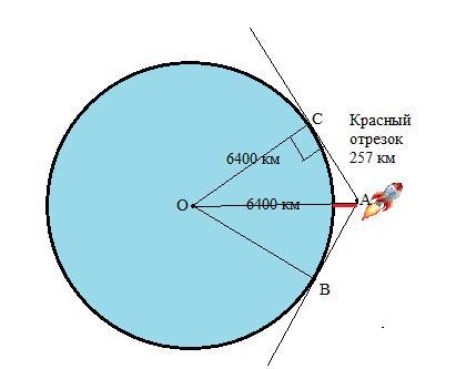 Найдем наиболее удаленную от космического корабля видимую точку . Это точка С. По т. Пифагора АС=√(6657²-6400²)≈1831,84 ( км).