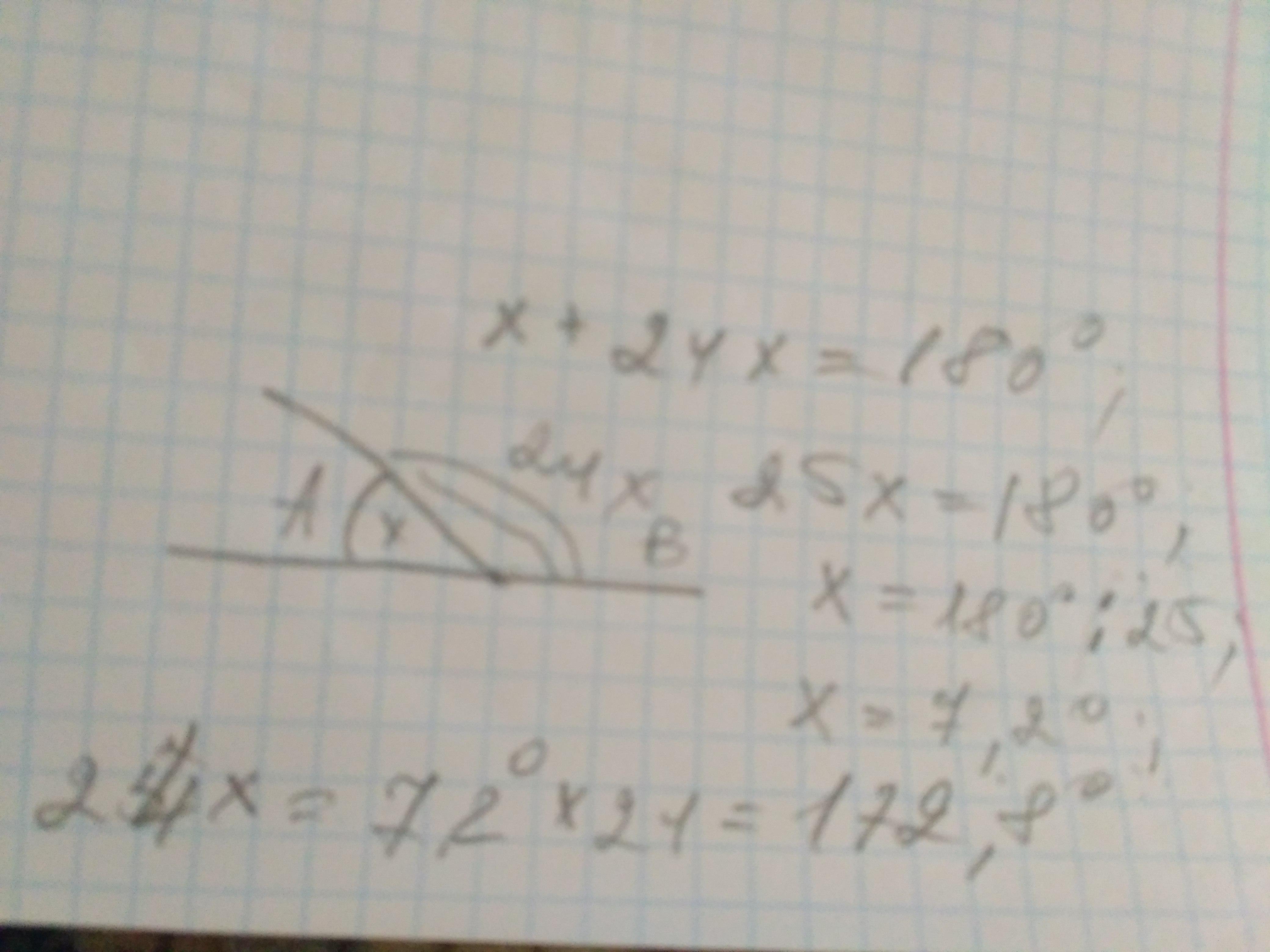 Найди величины смежных углов, если один из них в 24 раза больше другого.помогите решить и рисунок пожалуйста