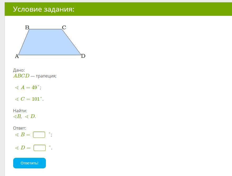 Сумма углов, прилежащих к боковой стороне трапеции, равна 180°, следовательно :