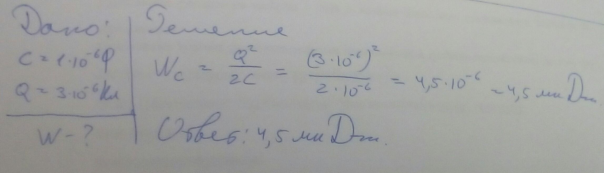СРОЧНООО!!! БАЛЛЫ ДАЮ!Конденсатору ёмкостью 1 мкФ сообщили заряд 3 мкКл. Какова энергия заряженного конденсатора?