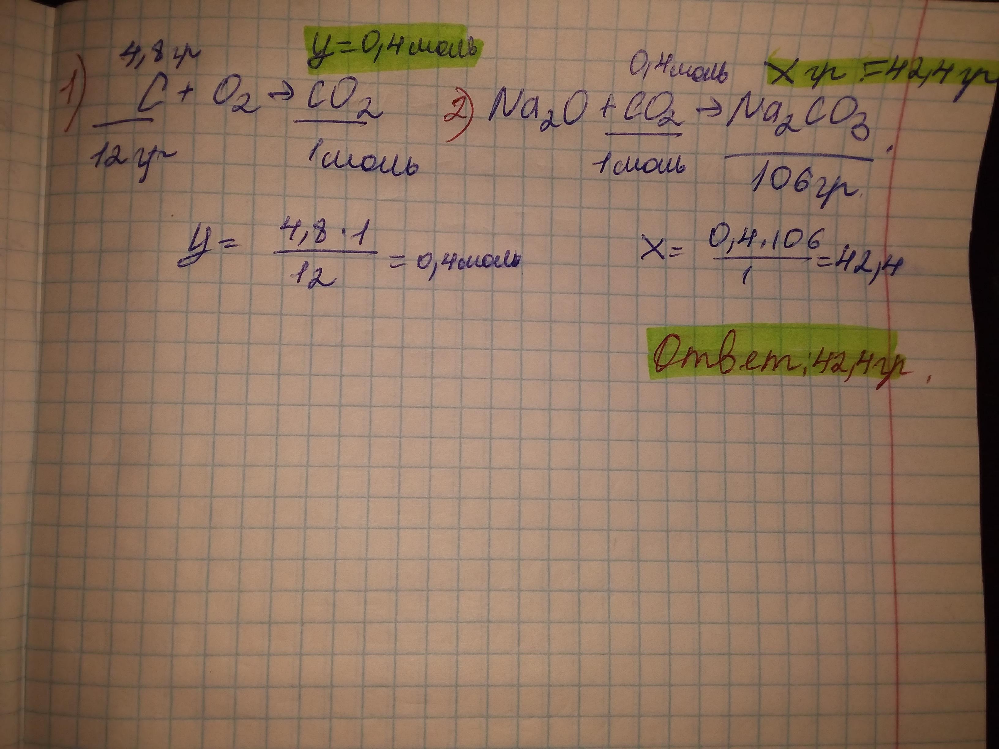 Напишите уравнения реакций.Обчислить массу образованной соли, если сожгли углерод массой 4,8 г