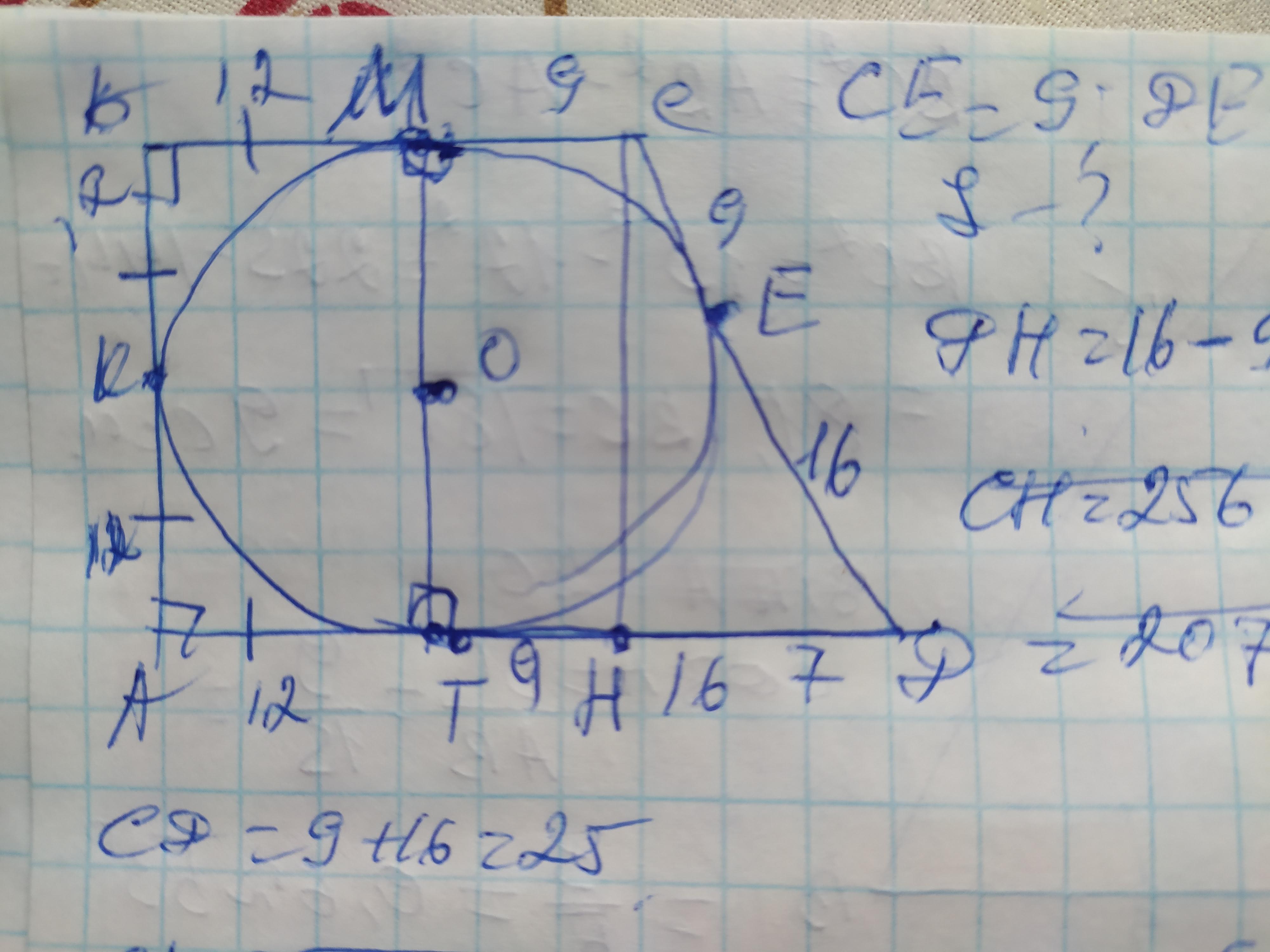 Объяснение: Обозначим вершины трапеции А В С Д а точки касания К М Е Т, центр вписанной окружности О. Стороны трапеции являются касательными к вписанной окружности и отрезки касательных соединяясь в одной вершине равны от вершины до точки касания, поэтому: МС=СЕ=9см, ЕД=ДТ=16см. Проведём к основанию АД две высоты СН и МТ, которые равны между собой и равны диаметру окружности. Они делят АД так что ТН=МС=9см, тогда ДН=16-9=7см. Рассмотрим полученный ∆СДН. Он прямоугольный,мгле СД- гипотенуза, а СН и ДН - катеты. СД=9+16=25см.