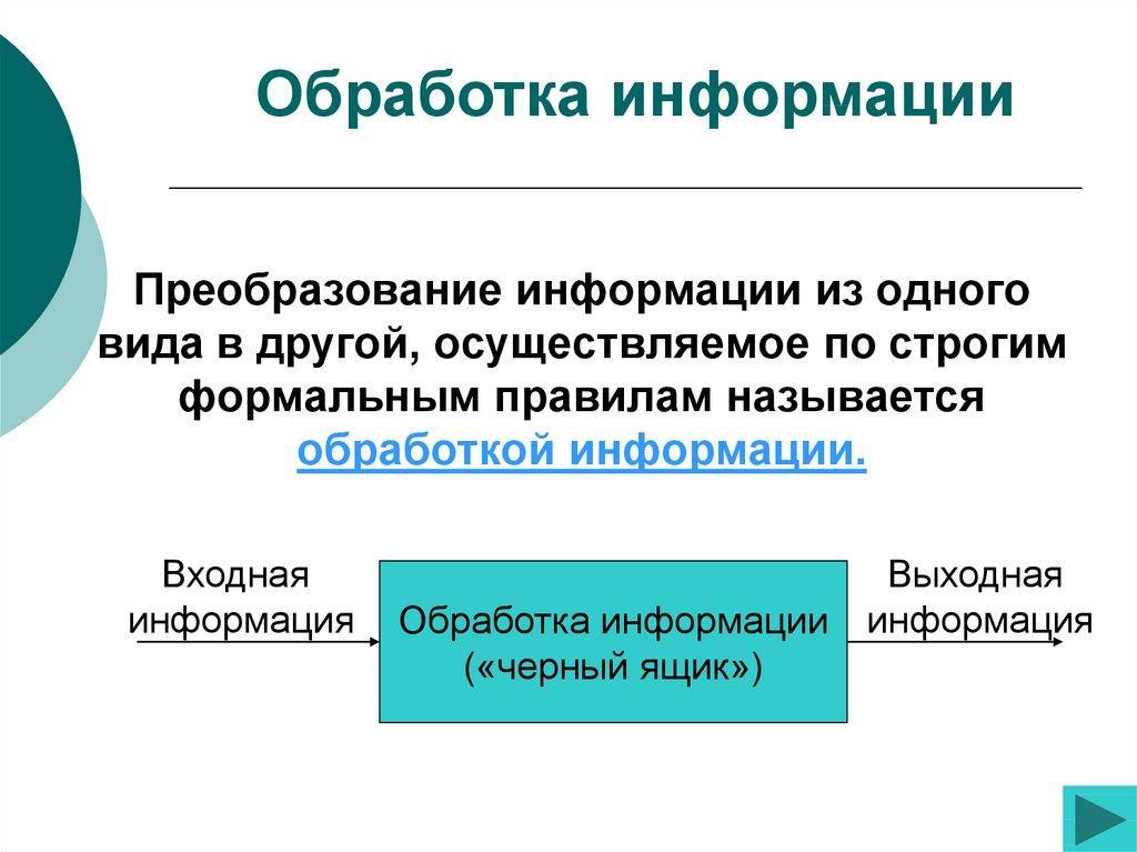 Обработка информации может производиться формально, руководствуясь правилами по заданному алгоритму. Либо применяется эвристический подход, при котором создаётся новая система действий или открываются неизвестные ранее закономерности изучаемой информации.