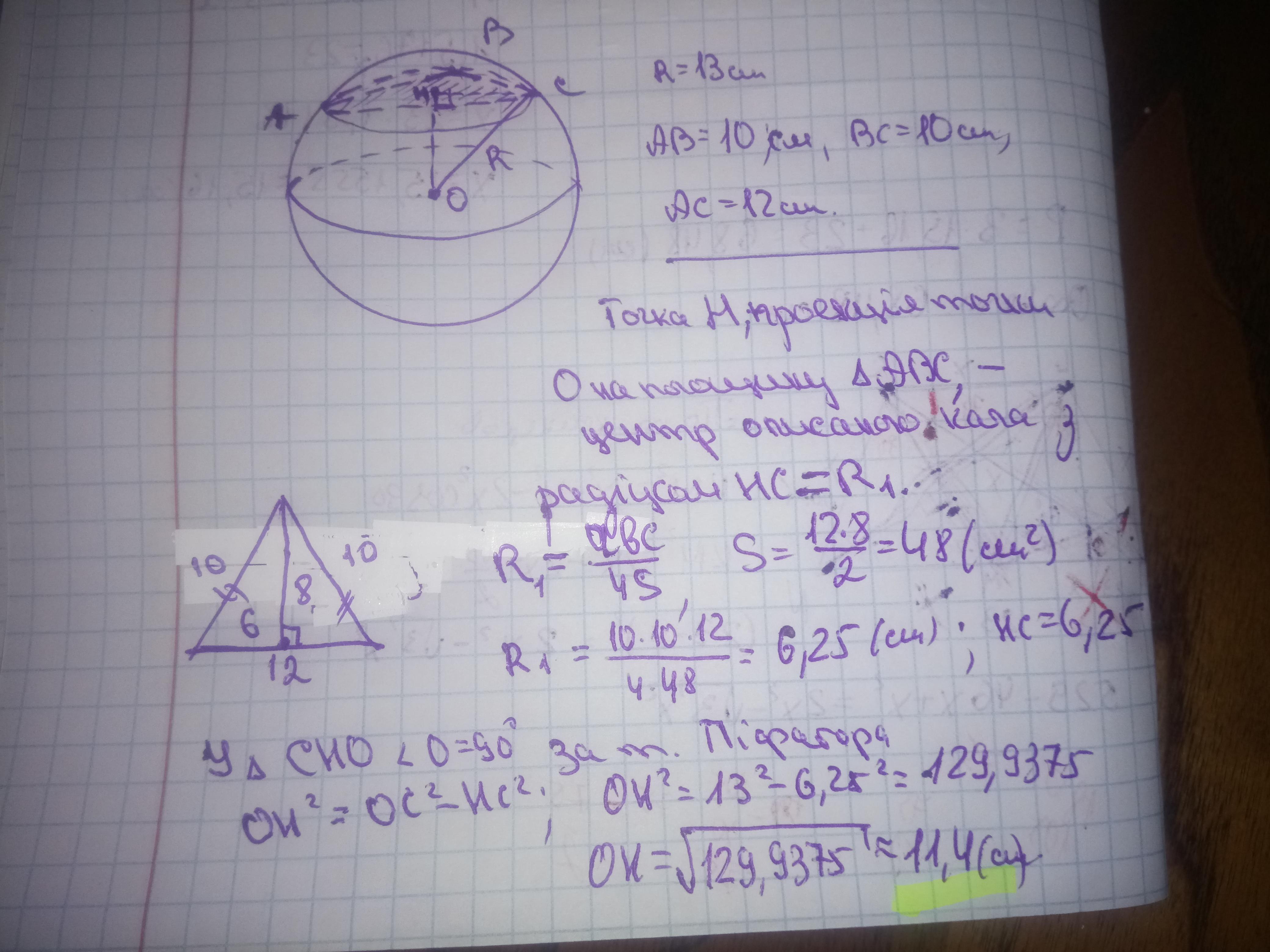 Вершини трикутника АВС лежать на сфері радіуса 13 см. Знайдіть відстань від центра сфери до площини трикутника, якщо його сторони рівні 10см, 10см і 12 см.