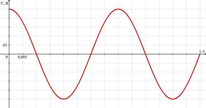 Напряжение в обмотке генератора меняется согласно графику. Рассчитайте частоту колебаний.
