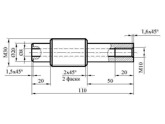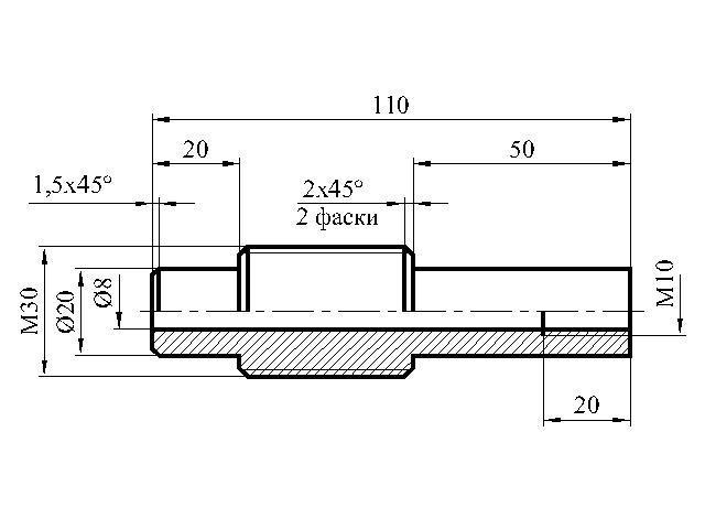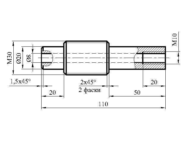 Левая часть детали, расположенной горизонтально, цилиндр ф 20 мм и длиной 20 мм. На нем снята фаска диной 1,5 мм под углом 45 градусов. Средняя часть детали - цилиндр ф 30 мм и длиной 40 мм. На нем с обеих сторон сняты фаски диной 2мм под углом 45°и нарезана метрическая резьба на всю длину. Правая часть цилиндр ф 20 мм и длиной 50 мм. В детали по