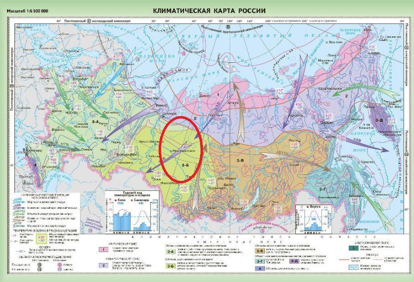 Как видно из карты климата России, которая дана ниже в приложении, это континентальный тип климата, которому присущ довольно суровый климат со значительными амплитудами среднегодовых и среднесуточных температур.