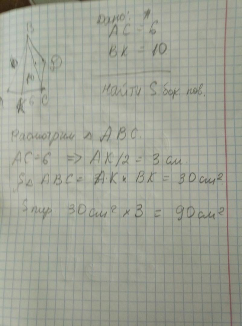 Дана правильная треугольная пирамида со стороной 6см и высотой боковой грани 10см. Вычислить площадь боковой поверхности пирамиды. Срочно заранее спасибо!