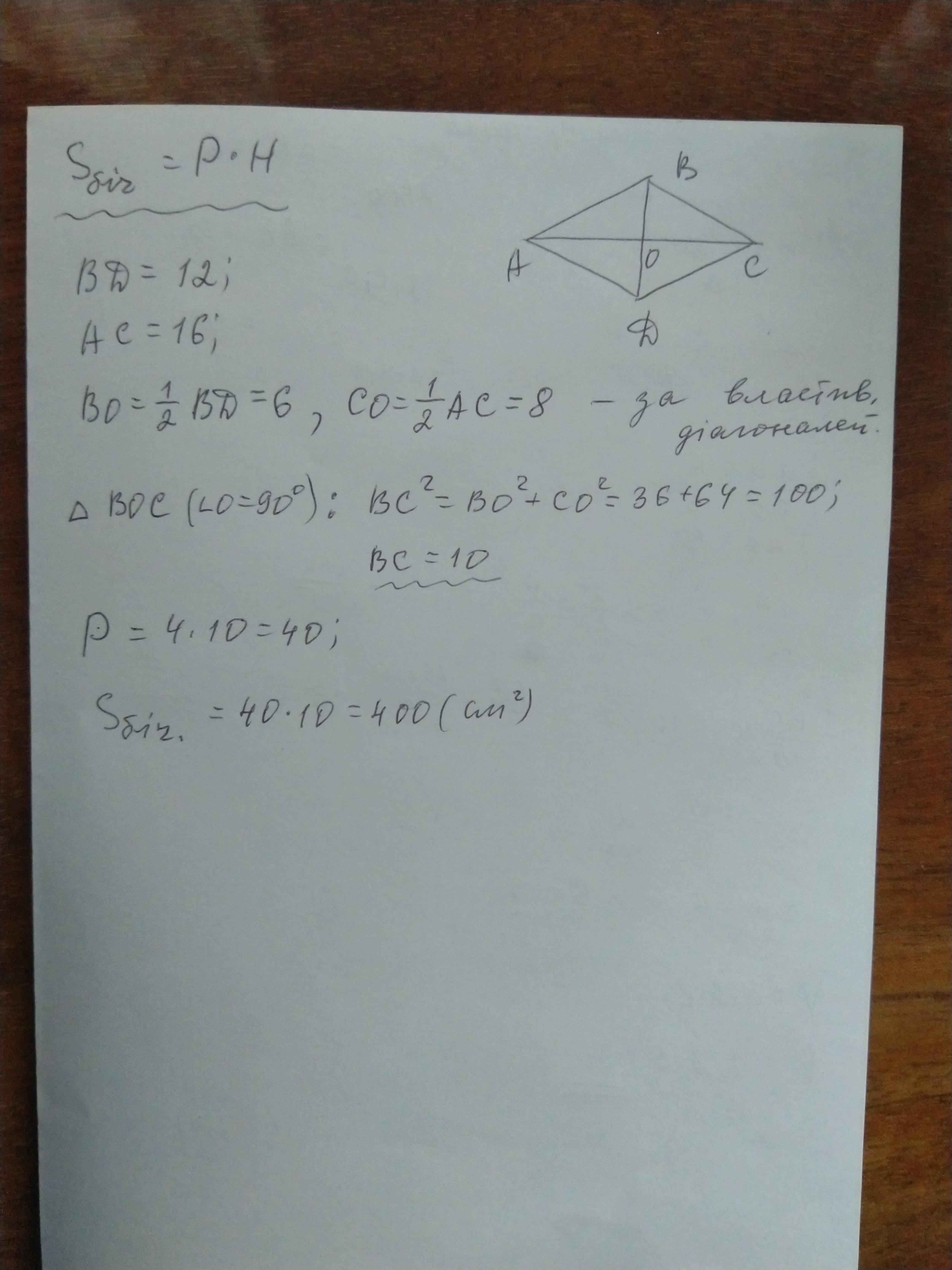 Основою прямої призми є ромб, діагоналі якого дорівнюють 12см і 16 см.Знайдіть площу бічної поверхні цієї призми, якщо її висота дорівнює 10см