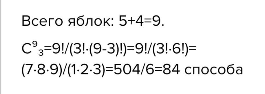 Вот сама задача ( В ящике лежат 5 красных и 4 зеленых яблока сколькими способами можно выбрать 3 яблока из ящика)