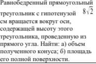 а) В этом случае нам нужно найти объем конуса. Радиус этого конуса будет равен половине гипотенузы ⇒ r=c/2=4√2 cм