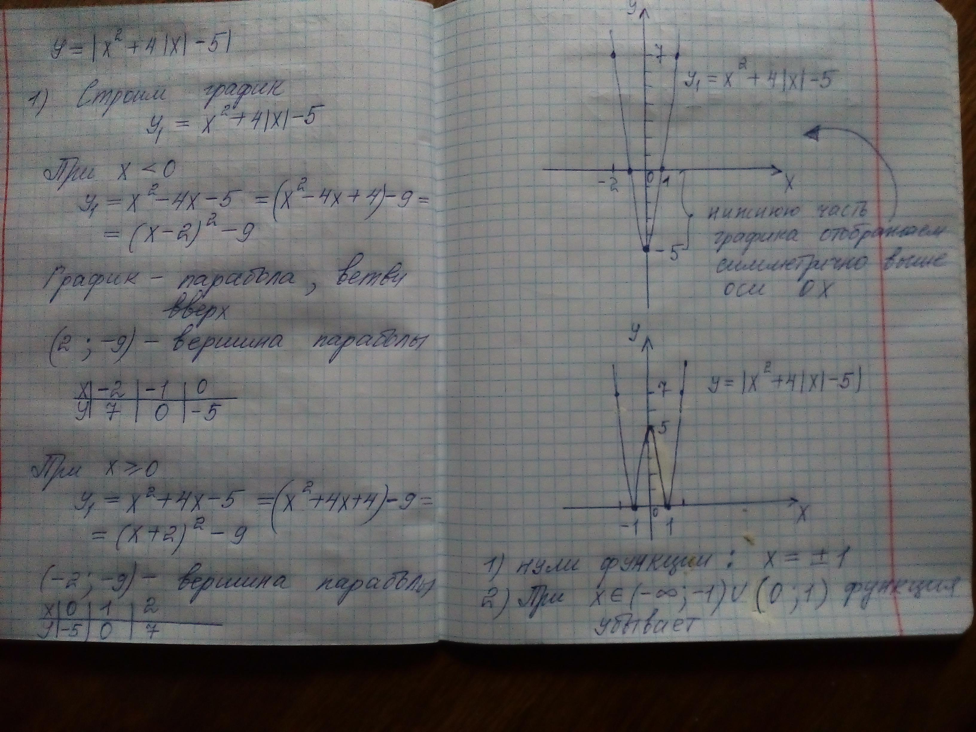 Постройте график функции у =|х^2+4|x|-5| и за его определите нули функции, промежутки монотонности, область значений функции.
