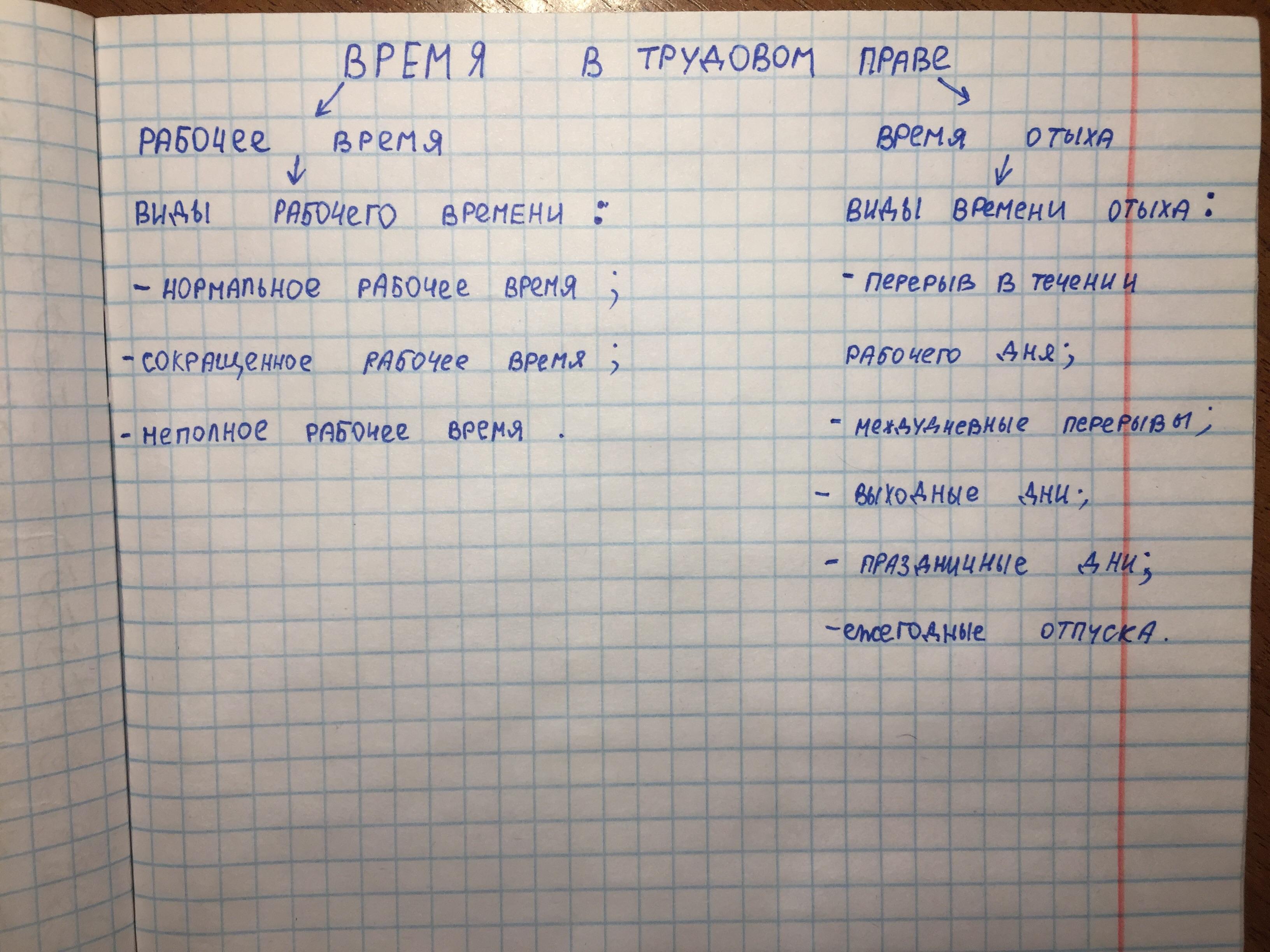 «виды рабочего времени», «виды времени отдыха», «нормальное рабочее время», «сокращенное рабочее время», «Неполное рабочее время», «перерыв течении рабочего дня», «междудневные переревы», «выходные дни», «праздничные дни», «ежегодные отпуска»