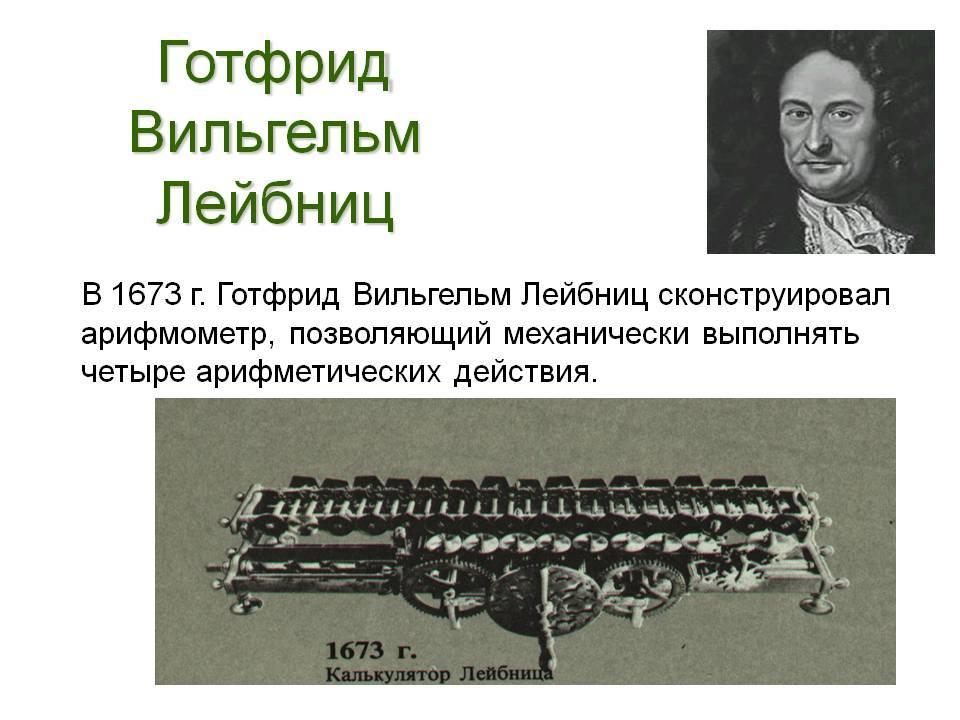 Первый арифмометр, позволявший проводить все 4 арифметические действия, был изобретен Г. Лейбницем в 1673 г.
