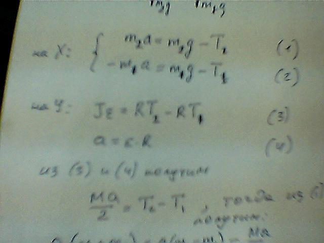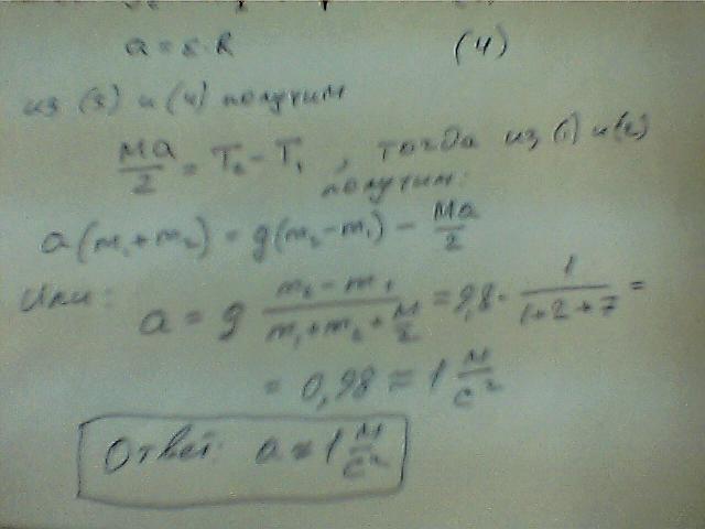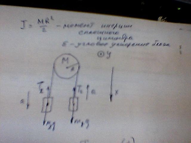 На нити, перекинутой через блок массой М = 14 кг имеются два тела массой m2 = 2 кг, m1 = 1 кг. Считая блок однородным цилиндром вычислить ускорение а, с которым перемещаются тела m1 и m2. М Т1 Т2 m1 m2