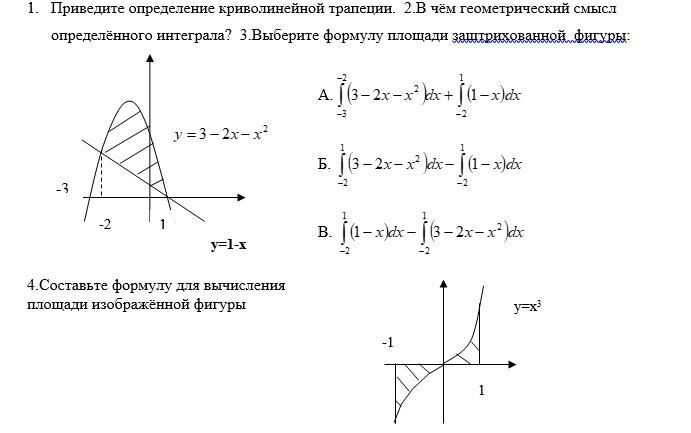 3. Б. То есть площадь заштрихованной фигуры - это интеграл по поверхности функции от 1 до -2, минус интеграл линейной функции на том же интервале.