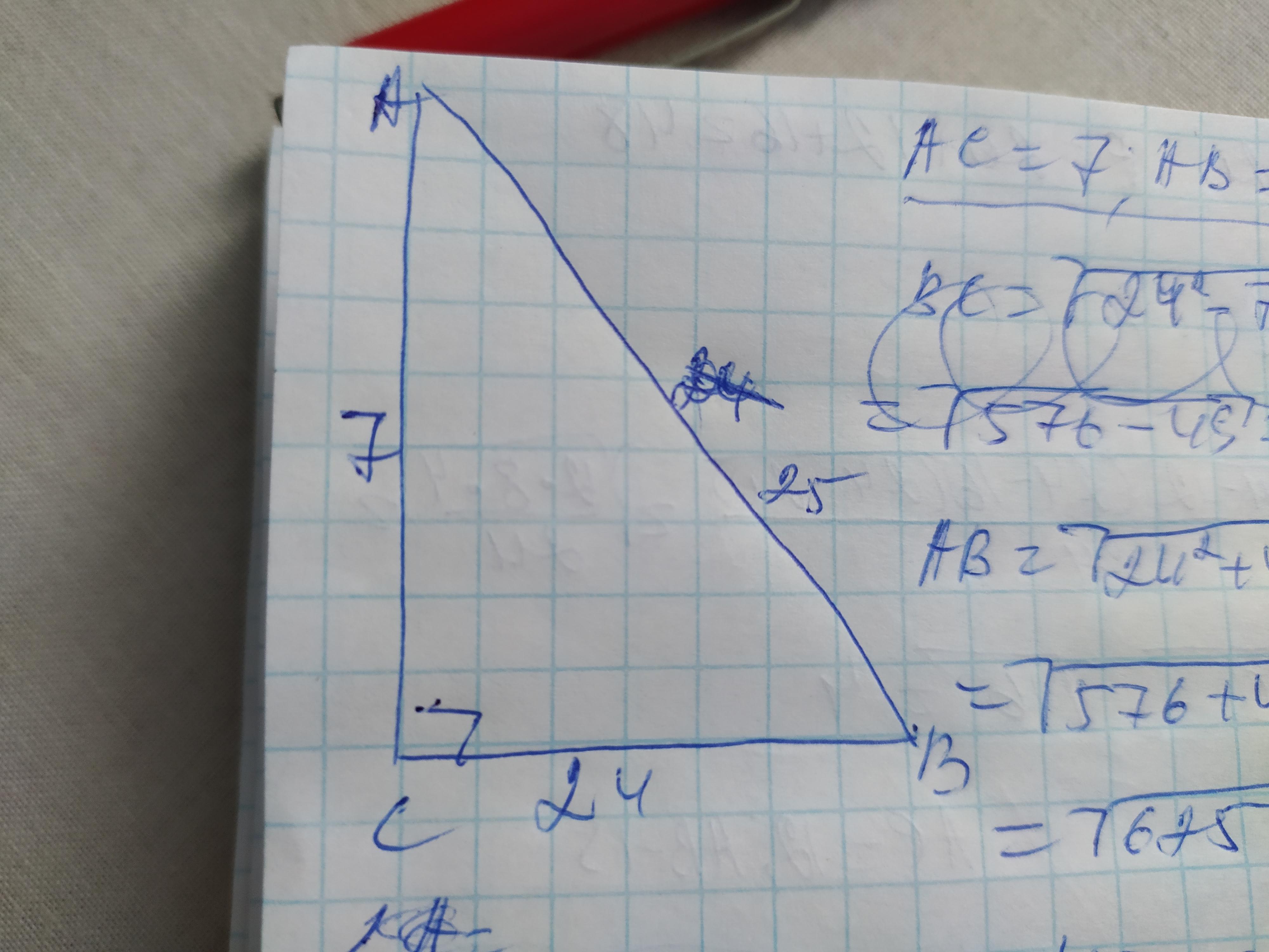 Объяснение: найдём АВ по теореме Пифагора: АВ²=АС²+ВС²=7²+24²=