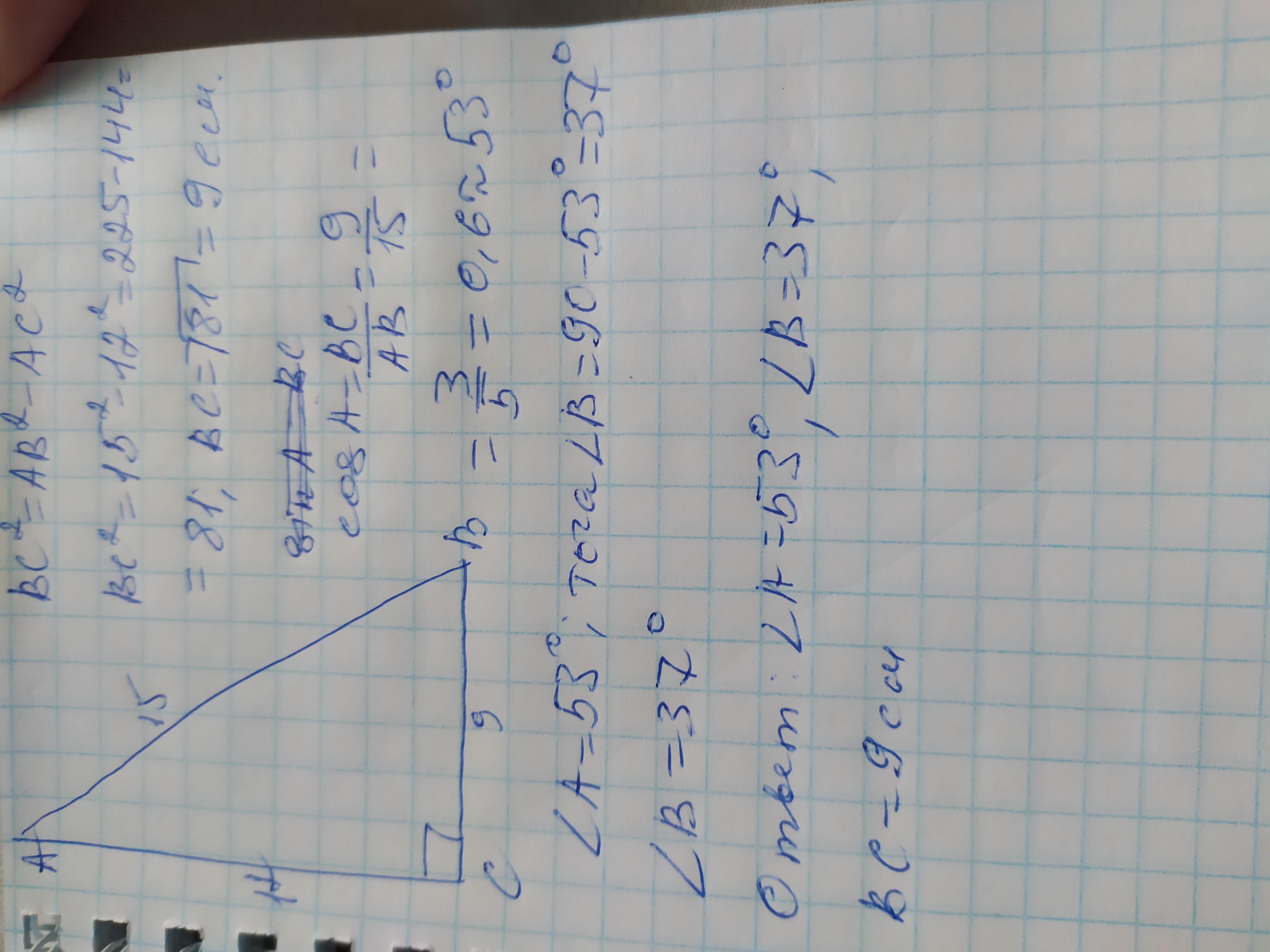 Найдём угол косинус унла А. Косинус это отношение прилежащего к углу катета к гипотенузе: