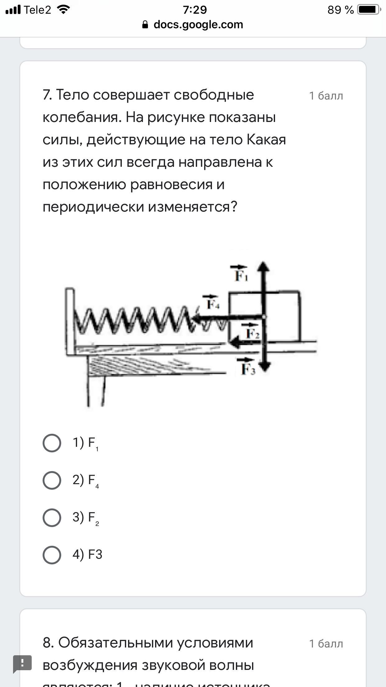 F4 - сила упругости пружины. Возникает при деформации. Направлена всегда к положению равновесия (стремится устранить деформацию) и меняется в зависимости от того, на сколько растягивается пружина или сжимается. Чем больше сжатие или растяжение, тем она больше. В данный момент пружина растягивается.