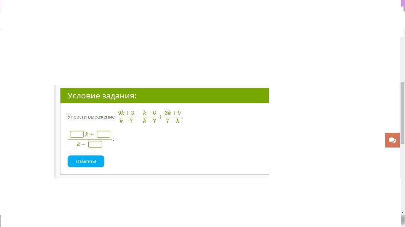 \frac{9k+3}{k-7}-\frac{k-6}{k-7}+\frac{3k+9}{7-k}=\frac{9k+3}{k-7}-\frac{k-6}{k-7}-\frac{3k+9}{k-7}=\frac{9k+3-k+6-3k-9}{k-7}=\frac{5k+0}{k-7}
