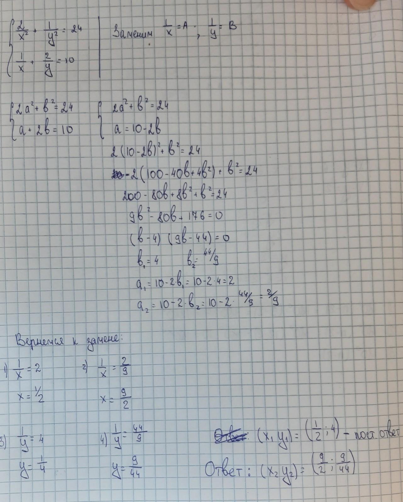 Помогите решить (в переводе решите за меня) систему уравнений или хотя - бы намекните как её решать. Система 2/x^2+1/y^2=24 и 1/x+2/y=10. Я перевёл 1/x и 1/y в A и В соответственно. Получается система 2а^2+b^2=24 и a+2b=10. А дальше как решать?