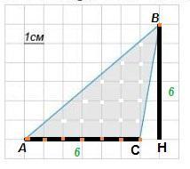 Длина основания АС равна 6 см. Длина перпендикуляра BH, опущенного из вершины к нижнему основанию, равна 6 см, тогда