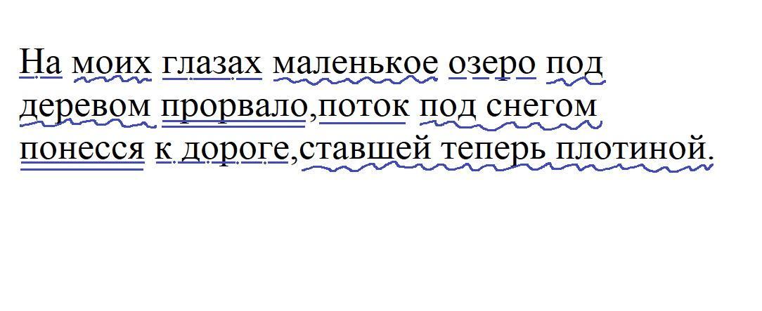 На моих глазах маленькое озеро под деревом прорвало,поток под снегом понесся к дороге,ставшей теперь плотиной.сделайте пожалуйста синтаксический разбор