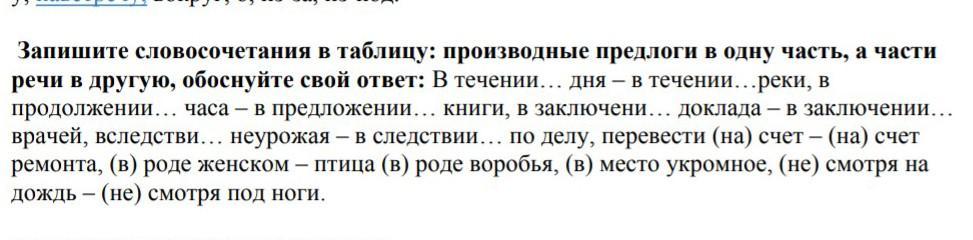Запишите словосочетания в таблицу: производные предлоги в одну часть, а части речи в другуо, обоснуйте свой ответ: