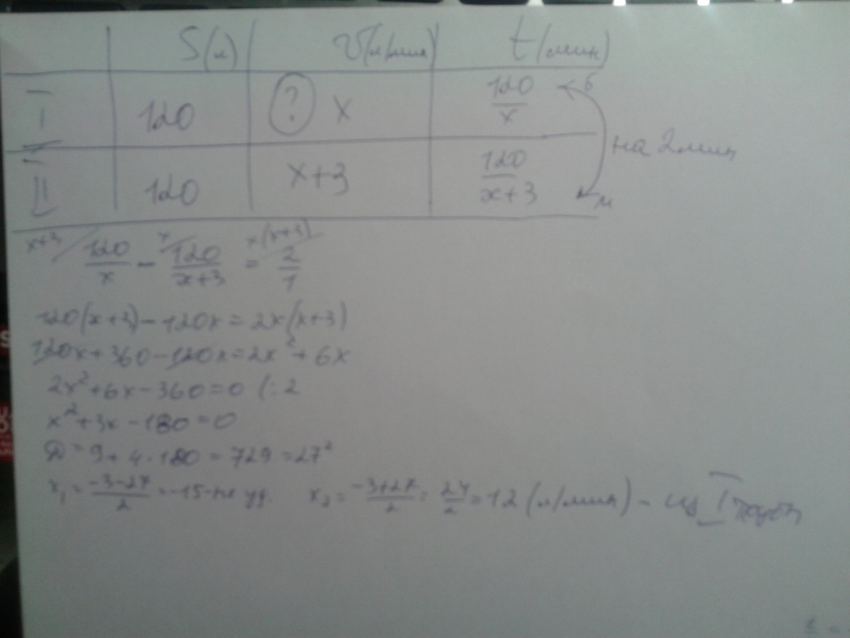 Первая труба заполняет резервуар объемом 120 литров на 2 минуты дольше, чем вторая труба заполняет этот же резервуар. Сколько литров воды в минуту поступает из первой трубы, если известно, что пропускная способность второй трубы на 3 литра в минуту больше пропускной способности первой трубы.