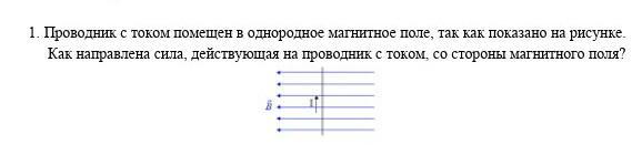 1. Проводник с током помещен в однородное магнитное поле, так как показано на рисунке. Как направлена сила, действующая на проводник с током, со стороны магнитного поля?