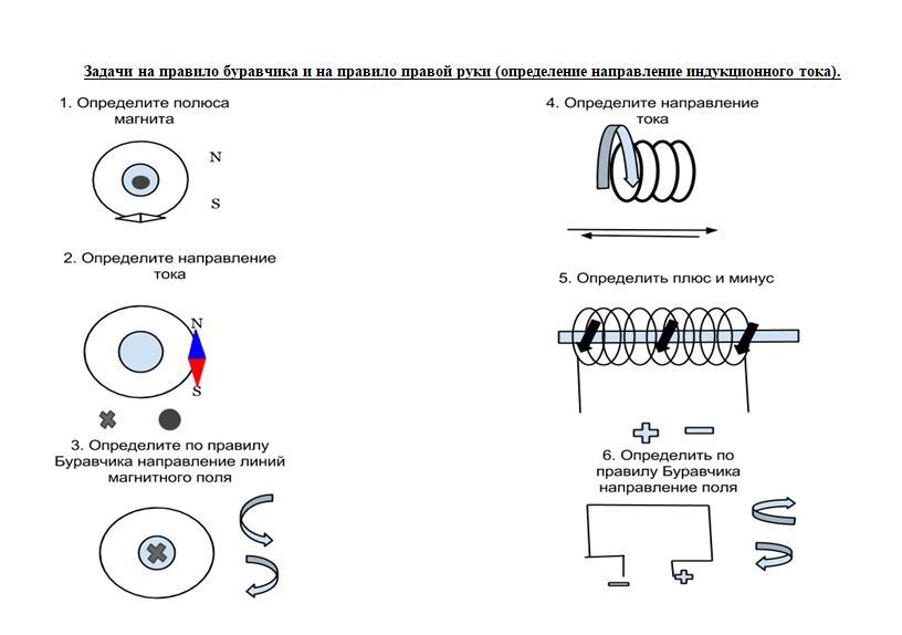 Правило буравчика (винта): Если направление поступательного движения буравчика (винта) совпадает с направлением тока в проводнике, то направление вращения ручки буравчика совпадает с направлением вектора магнитной индукции поля, создаваемого этим током.