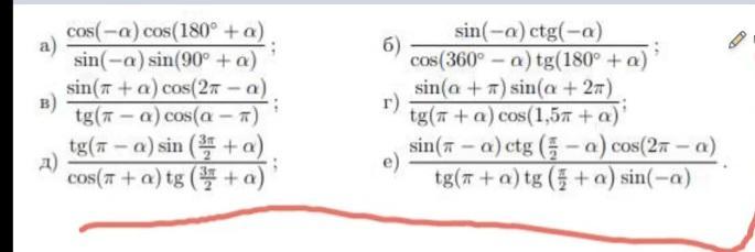 1)\ \ \dfrac{cos(-a)\cdot cos(180+a)}{sin(-a)\cdot sin(90+a)}=\dfrac{cosa\cdot (-cosa)}{-sina\cdot cosa}=ctga\\\\\\2)\ \ \dfrac{sin(-a)\cdot ctg(-a)}{cos(360-a)\cdot tg(180+a)}=\dfrac{sina\cdot ctga}{cosa\cdot tga}=\dfrac{sina\cdot cos^2a}{cosa\cdot sin^2a}=ctga\\\\\\3)\ \ \dfrac{sin(\pi +a)\cdot cos(2\pi -a)}{tg(\pi -a)\cdot cos(a-\pi )}=\dfrac{-sina\cdot cosa}{-tga\cdot (-cosa)}=-cosa