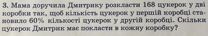 1 коробка 60%=60:100=0,6 від х цукерок - 0,6х цукерок