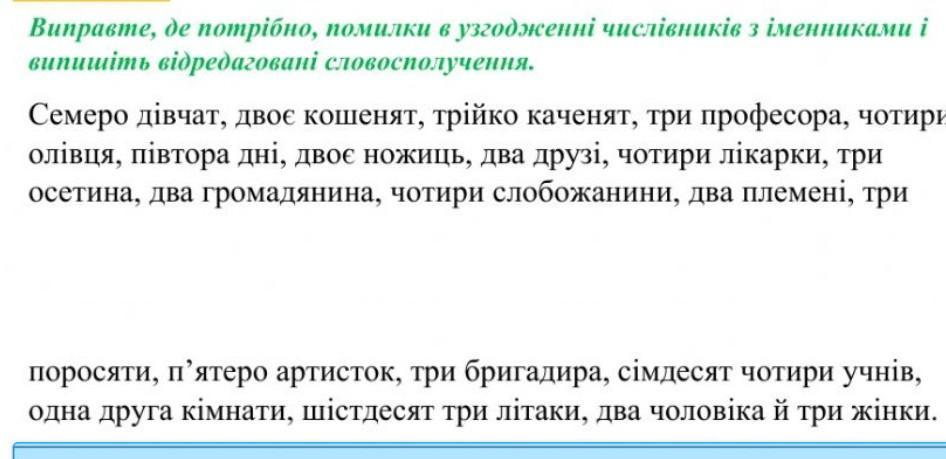 Семеро дівчат - сім дівчат, двоє кошенят, трійко каченят, три професора - три професори, чотири олівця - чотири олівці, півтора дні - півтора дня, двоє ножиць, два друзі - два друга, двоє друзів, чотири лікарки - чотири лікарі, три осетина - три осетини, два громадянина, чотири слобожанини, два племені, три поросяти, п’ятеро артисток - п’ять артисток, три бригадира - три бригадири, сімдесят чотири учнів - сімдесят чотири учні, одна друга кімнати, шістдесят три літаки, два чоловіка й три жінки - два чоловіки й три жінки.