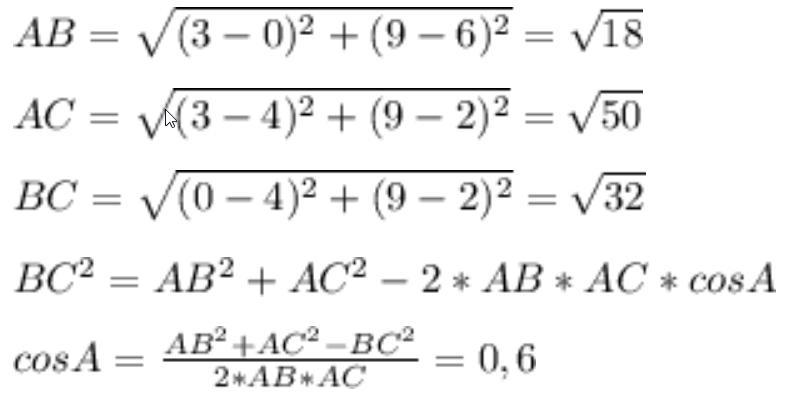 Найдите косинус угла С треугольника АВС, если А(3; 9), В(0; 6), С(4; 2).