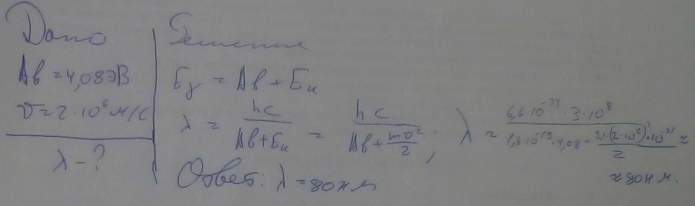 Какой должна быть длина волны излучения, падающий на кадмий, чтобы при фотоэффекте максимальная скорость фотоэлектронов была равна 2·10^6 м/с?