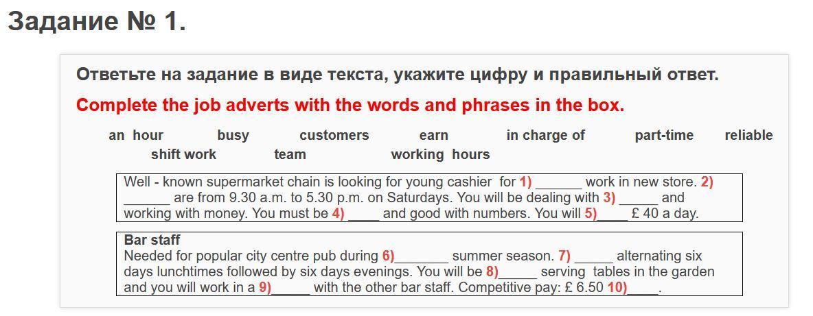 Давайте для начала переведем слова an hour- час, shift work- сменная работа, busy-занятый, трудный, работящий( зависит от контекста), team- команда, сostomers-клиенты, заказчики, покупатели, earn- зарабатывать,working houкse- рабочее время in charge of- ответственный за part-time- неполное время,занятость reliably-надежный Основываясь на это вставим слова