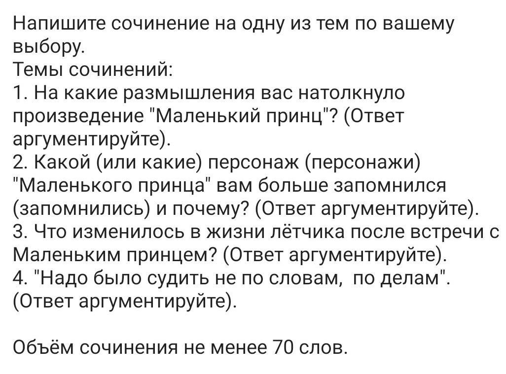 Помогите пожалуйста написать сочинение на одну из этих тем: на какие размышления Вас натолкнуло произведение "Маленький принц"? (ответ арнументируйте)
